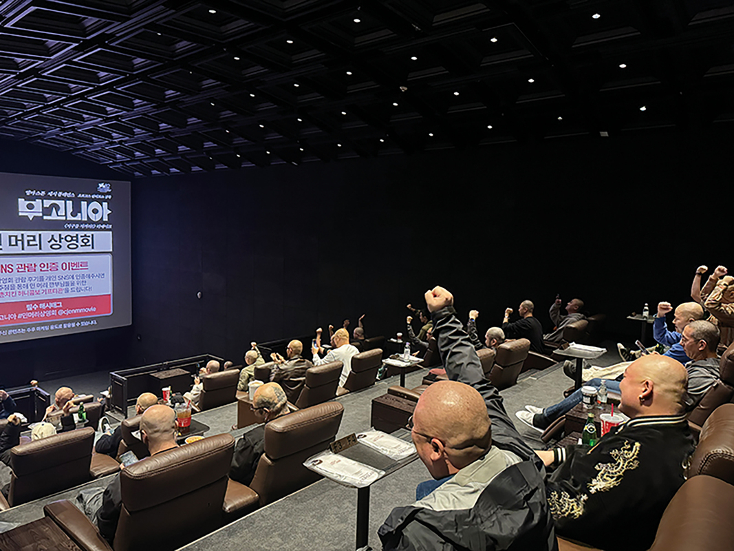 개봉 초기 입소문을 노리는 각종 시사회와 GV가 넘치는 가운데 2025년 가장 이색적인 시도는 <부고니아>의 민머리 상영회가 아니었을까. 지난 11월14일 CGV용산아이파크몰에서 펼쳐진 이 장관은 앞서 미국 LA에서 성황리에 개최된 이벤트를 따라 열린 것으로, 배우 에마 스톤이 안드로메다에서 온 외계인으로 지목받는 인물 미셸을 연기하기 위해 삭발을 감행한 것에서 착안했다. <부고니아> 속 인류 저항군 본부가 한국에서도 협상의 시간을 펼친다는 컨셉 아래 모인 빛나는 관객들은 “죽기 전에 생각날 시사회”로 이 자리를 마음에 새겼다고.