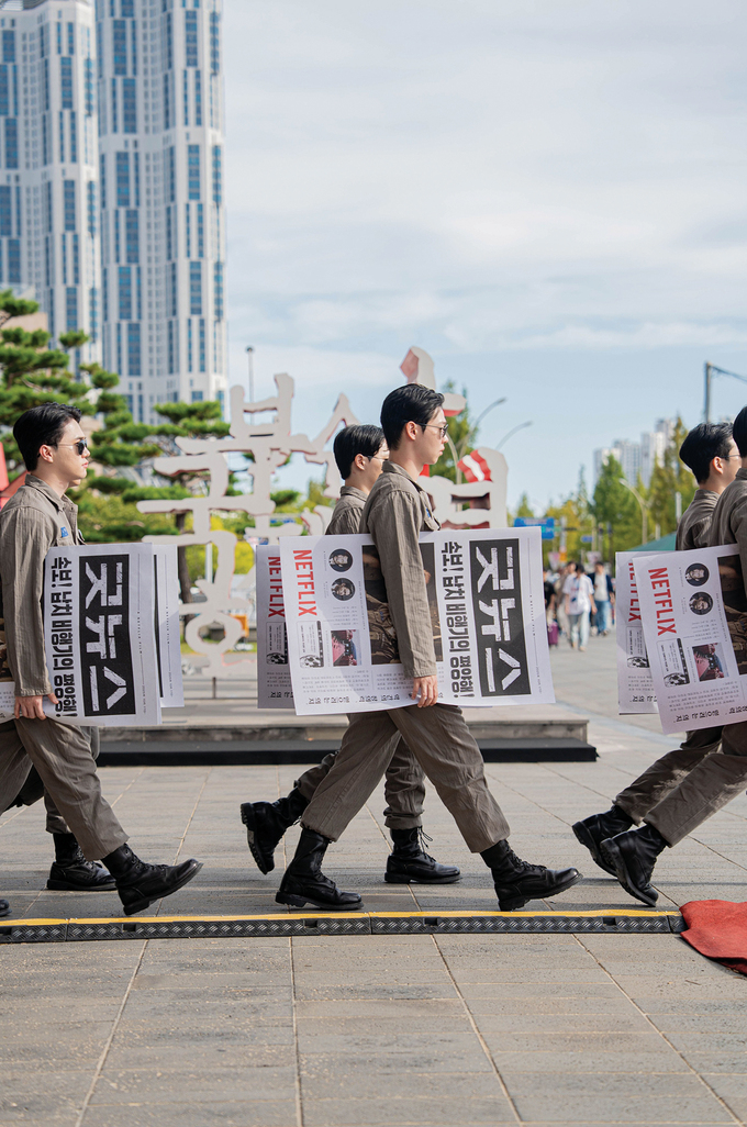 부산국제영화제는 독립영화, 상업영화, OTT 시리즈까지 수많은 한국 작품이 첫선을 보이는 장소다. 가지각색의 홍보물이 각축전을 벌이는 이곳에서 눈에 띄기란 쉽지 않다. 넷플릭스 영화 <굿뉴스>는 이 과제를 슬기롭게 돌파했다. 전단을 배포하는 것에 그치지 않고, 전단을 들고 다니는 행위 자체를 퍼포먼스로 승화한 것이다. 극 중 서고명 대위(홍경)의 복장을 그대로 입은 남성들이 영화제 기간 중 ‘속보! 납치 비행기의 평양행!’이라는 헤드라인이 크게 박힌 호외를 나르며 돌아다녔다. 단체로 선글라스까지 갖추고 영화의전당 안팎을 쏘다닌 이들은 예비 관객의 호기심을 제대로 자극했다.